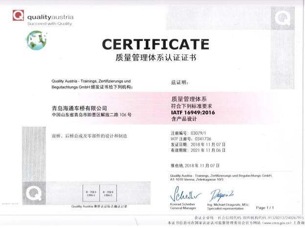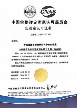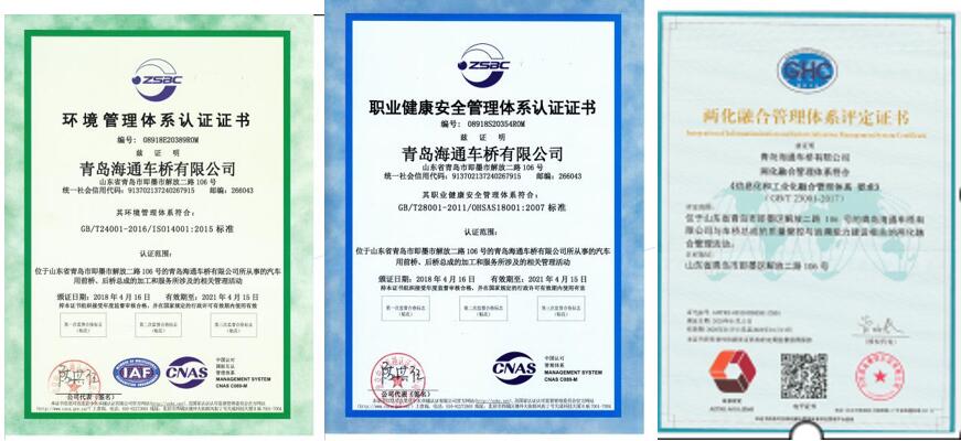 青島海通車橋有限公司成立于1994年,注冊資金2000萬元,位于山東省青島市即墨區(qū)解放二路106號。公司先后獲得“中國誠信企業(yè)”、“國家級認可實驗室”、“高新技術(shù)企業(yè)”、“山東省企業(yè)技術(shù)中心”、“山東省守合同重信用企業(yè)”、“山東省著名商標”、“質(zhì)量信用AAAAA級企業(yè)”、“AAA級企業(yè)信用等級”等榮譽。先后通過了質(zhì)量、環(huán)境、職業(yè)健康安全、兩化融合等管理體系認證。