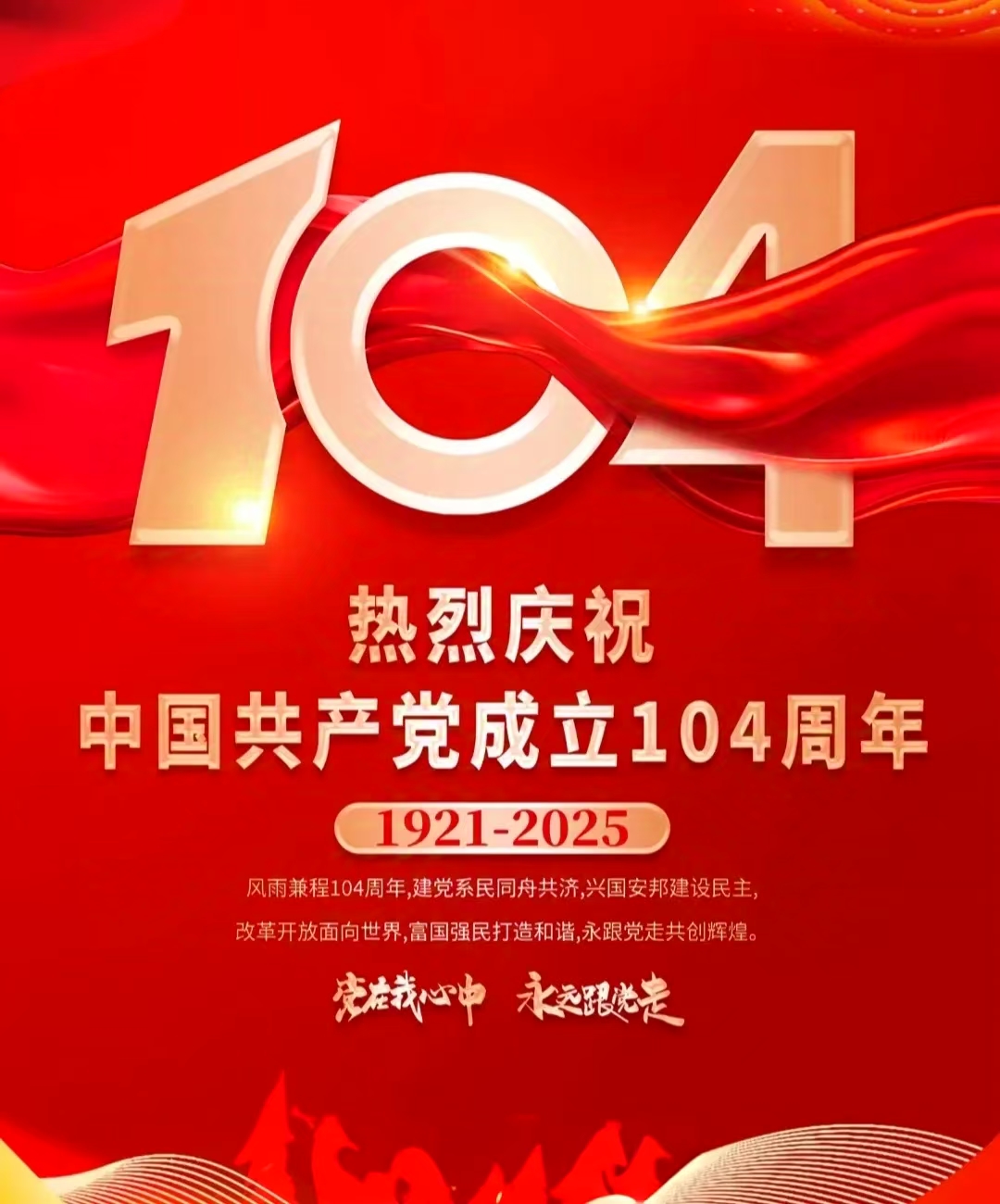讓我們共同慶祝中國共產(chǎn)黨成立104周年,向偉大的黨致以最崇高的敬意!讓我們緊密團結在黨的旗幟下,不忘初心、牢記使命,為全面建設社會主義現(xiàn)代化國家、全面推進中華民族偉大復興而團結奮斗!在新時代的偉大征程中,續(xù)寫中國共產(chǎn)黨和中國人民新的輝煌篇章!